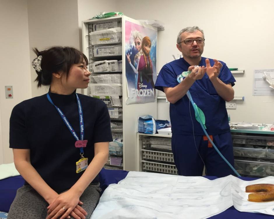 高级麻醉护士Thomas(右)和手术室护长Teresa(左)为我们演示为患儿进行麻醉诱导的大致流程