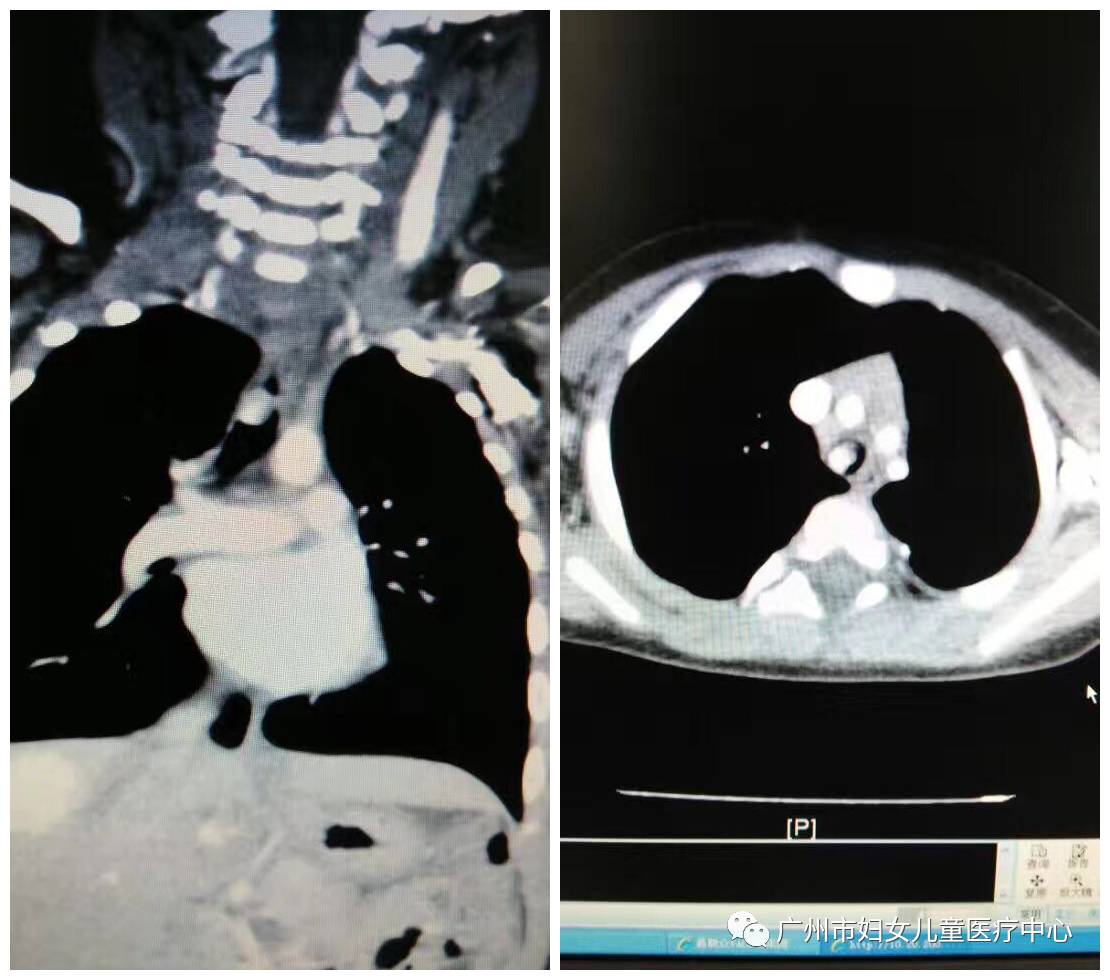 ECMO患儿术前CT显示:主气管占位及肝内血管瘤