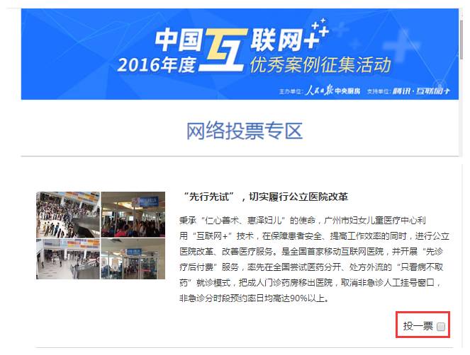 市妇儿医疗中心入选人民网主办的2016年度中国互联网+优秀案例征集活动,请各位小熊粉们支持我们的投票,点击“投票链接”,选择“先行先试,切实履行公立医院改革”,勾选“投一票”点击投票即可。