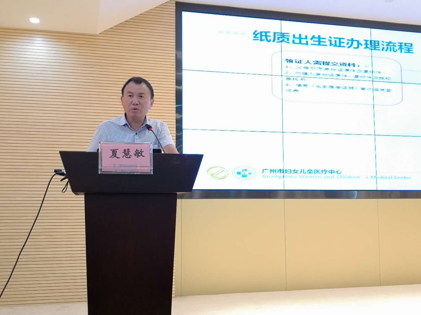 市妇儿医疗中心夏慧敏院长首先介绍了纸质出生医学证明存在的问题、申领及签发流程、电子证照的优势及意义。随后由市妇儿医疗中心医务部主任孙新通过视频解说,展示首张出生医学证明电子证照诞生过程。